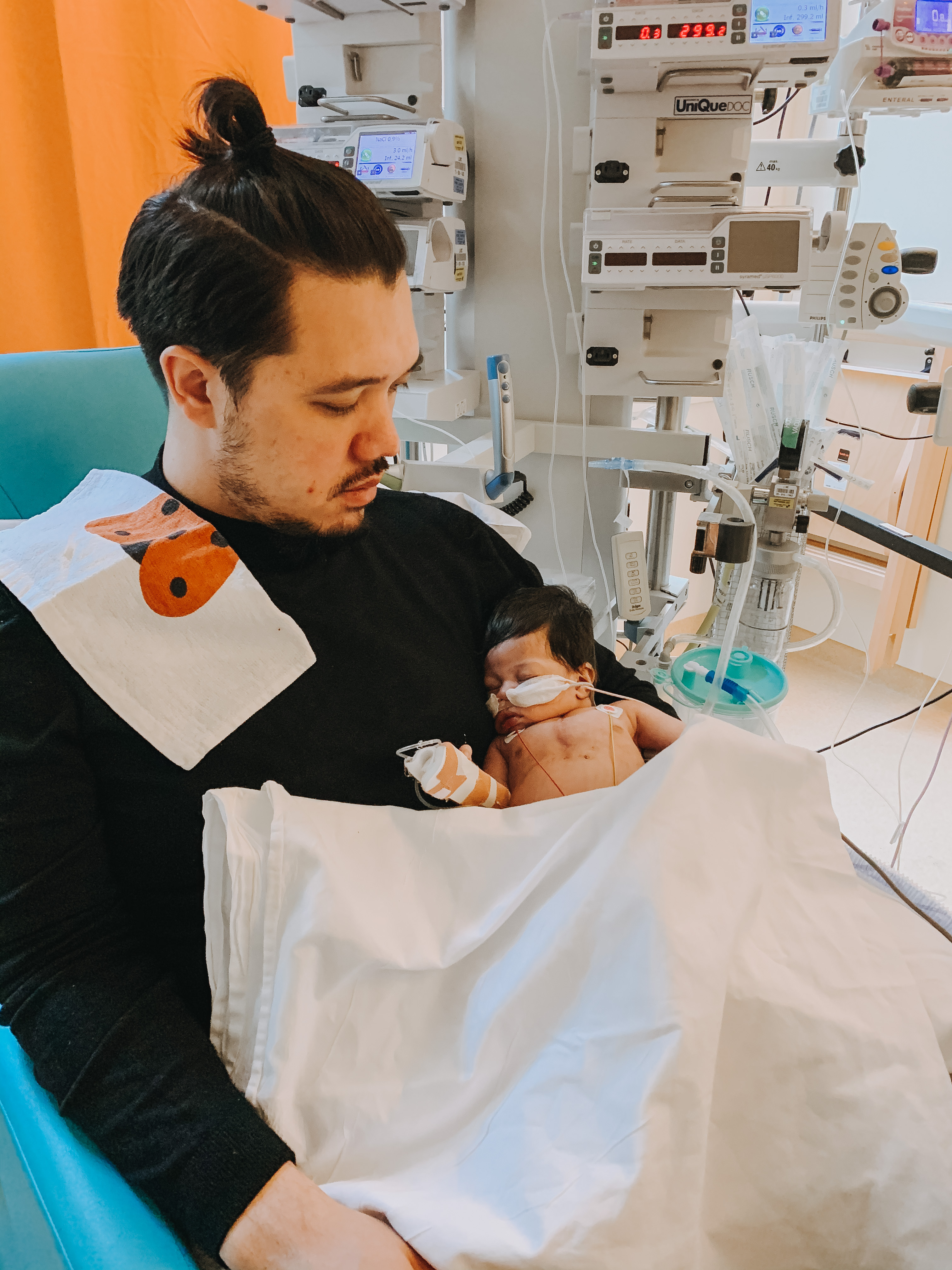 Unfortunately there have been quite a few of those as well. Fever has been a regularly occurrence, especially at night. Since her infection in February she has had two infections in March as well. Earlier this month she took it quite well. This week was a bit harder. Evvy has been a bit more stressed and really needed her mom and dad to comfort her. The nursing staff is amazing here and they do everything they can, but she needs to be held by her mom. Her favourite thing to do whilst being held by mom is looking at dad.