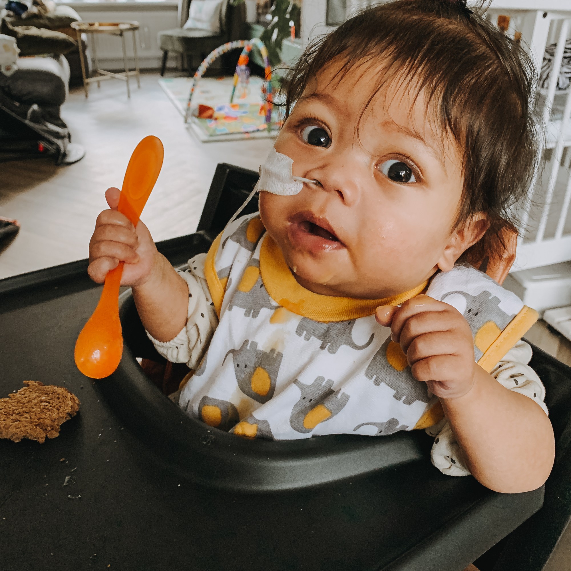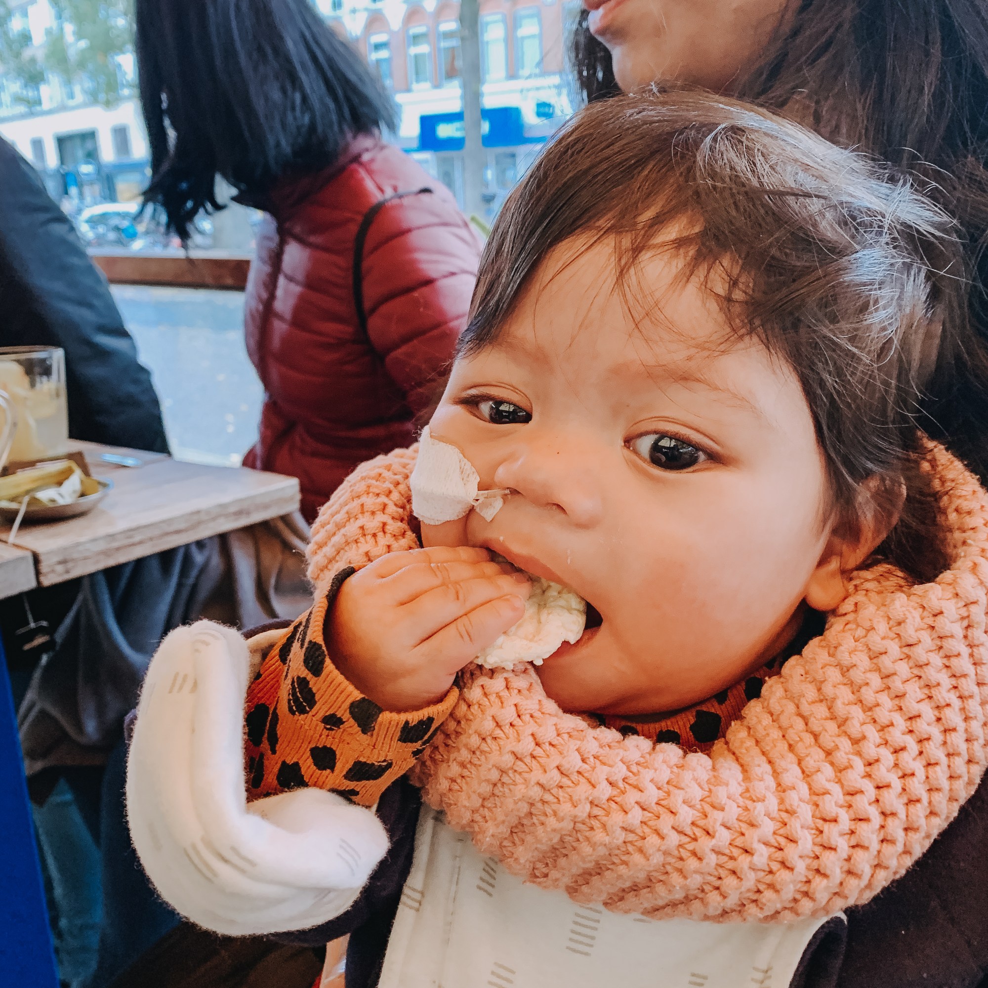 In the days after our ambulance adventure, we noticed Evelyn started finishing (or close) her bottle more regularly. We noticed that for a number of days, she drank more than 500 mL and additionally ate some solids and mashed fruits and veggies. So after consulting our cardiologist and our dietician, we took out the tube for a ten day trial! We are halfway now and Evelyn is doing great. She is drinking and eating enough! So we hope the tube can stay out.